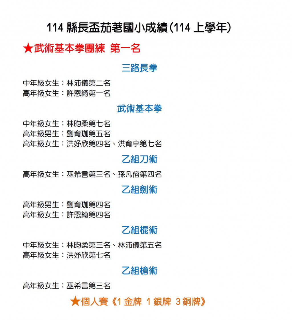 賀本校參加彰化縣114學年度縣長盃武術錦標賽榮獲團體獎項:武術基本拳團練第1名。個人獎項:1金牌、1銀牌、3銅牌。